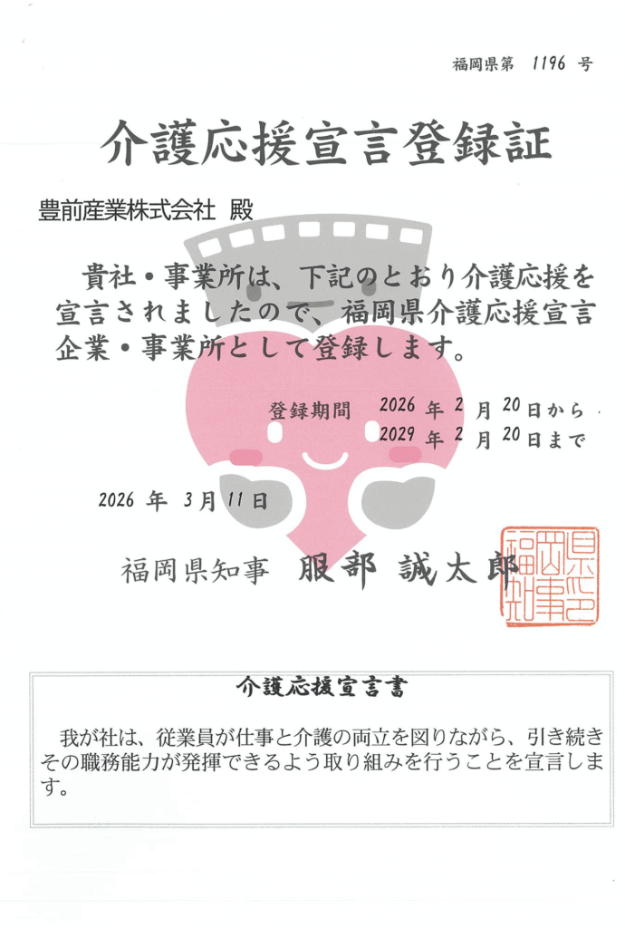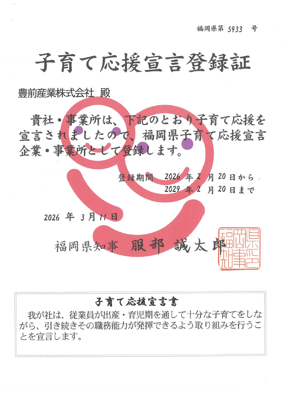 弊社は福岡県、「SDGs」、「介護応援宣言」、「子育て応援宣言」登録事業所です。